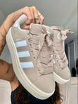 Sneakers Adidas Campus en daim beige, très tendance. Lacets roses pâle et trois bandes blanches....