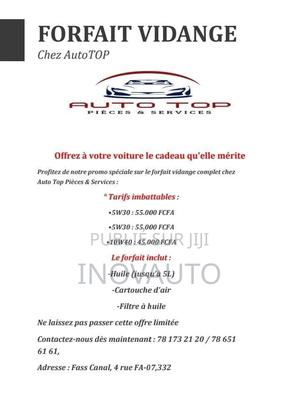 Forfait vidange en promotion chez Auto TOp -Huile -Cartouche à Air -Filtre à huile Contact:(Whatsapp)