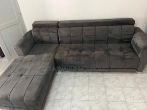 Canapé d'angle gris foncé en très bon état.