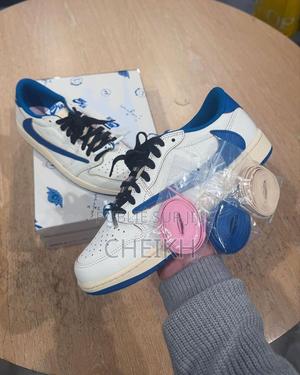 Sneakers Nike au design moderne avec Swoosh inversé signature Travis Scott, en cuir blanc et bleu. Confortables et stylées, elles sont livrées avec plusieurs lacets pour personnaliser votre look.