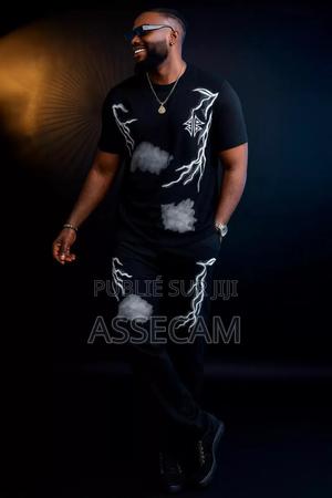 • T-shirt noir avec motifs nuages et éclairs imprimés, parfait pour un look tendance.